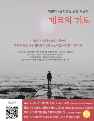 시카고 이민자보호교회 네트워크가 주관하는 ‘게르의 기도’가 오는 8일(일) 오후 5시 시카고한인제일연합감리교회에서 열린다.‘게르’는 이방 땅에 거주하는 외국인 또는 이주민을 뜻하는 히브리어로 이번 기도회는 서류미비자, 유학생, 난민 등 이 땅에서 다양한 모습으로 살아가는 이민자들과 함께 불안과 염려를 내려놓고 하나님께 희망을 구하는 시간이 될 예정이다.기도회는 찬양을 시작으로 이민자들의 생생한 사연을 듣도 중보기도로 함께하는 순서로 구성된다. 이민자의 현실에 공감하고 연대의 기도를 드리며, 참석자 모두가 '우리 또한 이 땅의 게르'