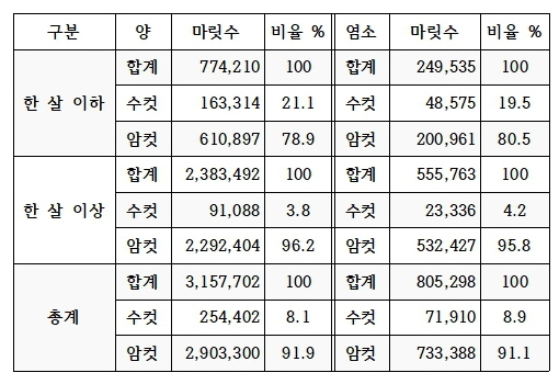 한 살 이하의 수컷 양 비율은 전체의 21.1%인데 비해 한 살 이상에서는 3.8%로 크게 줄어든다. 암수 비율이 4:1에서 24:1로 바뀌는 것이다. 이는 대부분의 수컷 양이 한 살이 되기 전에 도축된다는 사실을 시사한다. 수컷은 번식용으로 남겨지거나 거세된 후 판매되기 때문이다. 한편 염소의 암수 비율은 4:1에서 24:1로 거의 양과 비슷한 수준으로 변하고 있다.