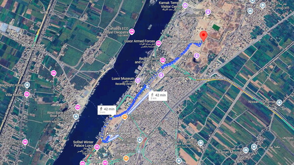 북쪽의 카르나크 신전에서 양 머리 형상을 한 스핑크스의 행렬은 10킬로미터를 이어 남쪽의 룩소르 신전까지 연결되었다고 전해진다. 지금은 군데군데 폐허의 잔해만이 3,500년 연륜의 역사를 초라하게 설명해 주고 있다. - 이희수, "이집트 - 룩소르 이집트 대중의 시대가 열렸던 곳", <이희수 교수의 세계도시문화기행 06 중동 고대도시와 문화도시>, 청아출판사, 2014.