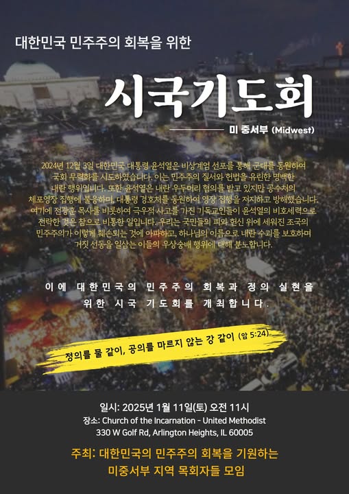 이에 다음과 같이 미국의 전역에서 우리의 조국인 대한민국의 민주주의와 정의를 위해 미국 전 지역에서 시국기도회의 개최를 촉구합니다.