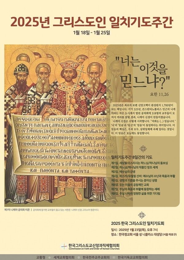 또한, “1700년의 시공간을 초월해 2025년 믿음의 공동 유산에 초대받은 그리스도인 일치기도주간을 통해 켜켜이 쌓아온 우리의 하나된 믿음과 실천이 혼동과 갈라짐의 시대 속에서 평화와 생명의 길을 여는 기적이 되길 간절히 기도한다”고 청했다.