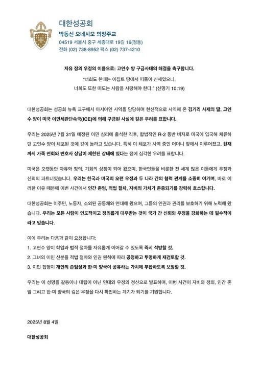 한국에서도 대한성공회 박동신 오네시모 의장주교가 8월 4일 ‘자유·정의·우정의 이름으로: 고연수 양 구금 사태 해결 촉구’ 성명을 발표했다. 성명은 △고 양의 학업과 법적 절차를 보장할 즉각적 석방 △적법 절차와 인권 원칙에 따른 재검토 △한미 양국이 공유하는 가치에 부합하는 이민 집행을 요구했다.